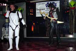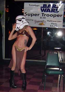 Also conspicuously present were two Storm Troopers, straight from the Death Star. Unlike the afformentioned Junior Officer, these guys pulled all the stops on their outfits, right down to the mini-microphones in their helmets that gave their voices that authentic walkie-talkie quality. One was tall and sort of stooped over a bit. The other whose orange shoulder flap denoted formal dress -- took off his helmet. He appeared to be an accountant in his early 40s in snuggly fitting fiberglass. His suit was both concealing and sort of revealing at the same time especially in the crotch area. It was almost like watching a grown man swagger around the room in leotards. His name was Jerry.